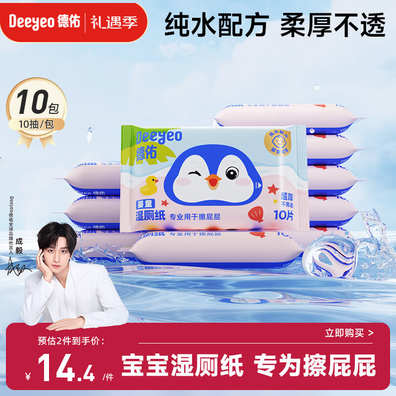 德佑婴童湿厕纸宝宝红屁屁护臀专用便携装10片10包母婴级纯水可冲马桶