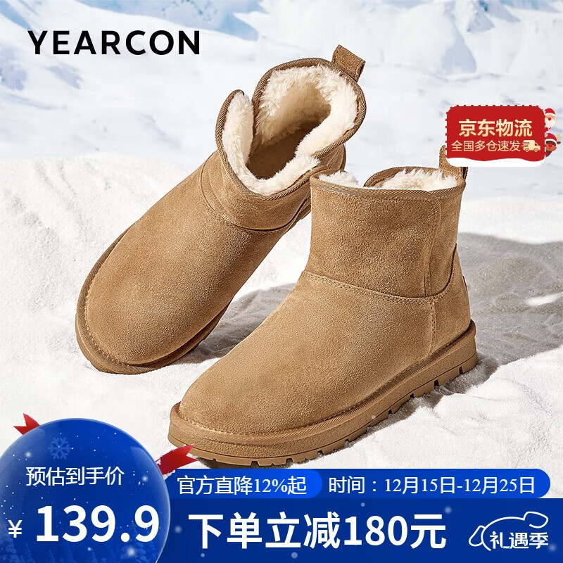 意尔康雪地靴女短筒棉鞋加绒女靴保暖面包鞋 26322W 浅棕色 38