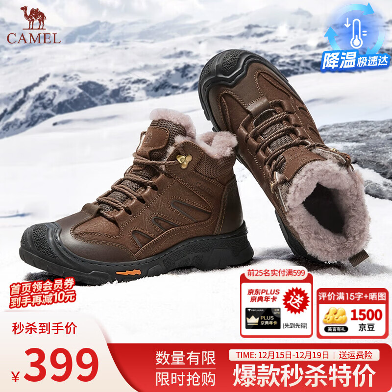 骆驼(CAMEL)男鞋 羊毛加绒厚底雪地靴真牛皮保暖马丁靴户外徒步登山鞋男 G13W307076暗棕 42