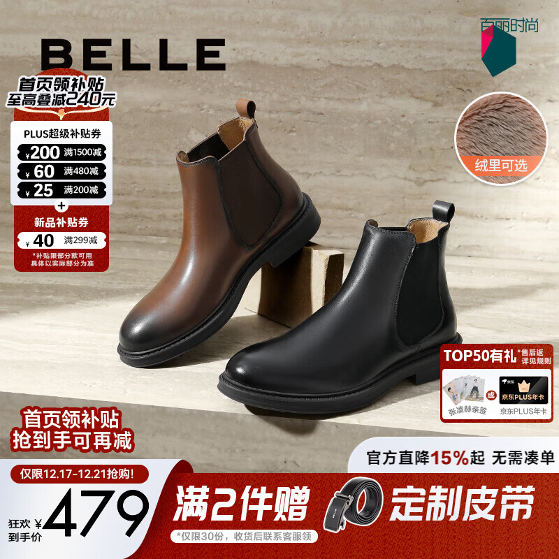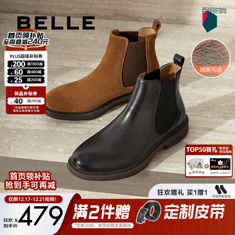 百丽(Belle)男鞋加绒加厚短靴冬季新款休闲户外切尔西马丁工装靴A1691DD4预售 棕色-绒里(皮面款) 44 (270mm)