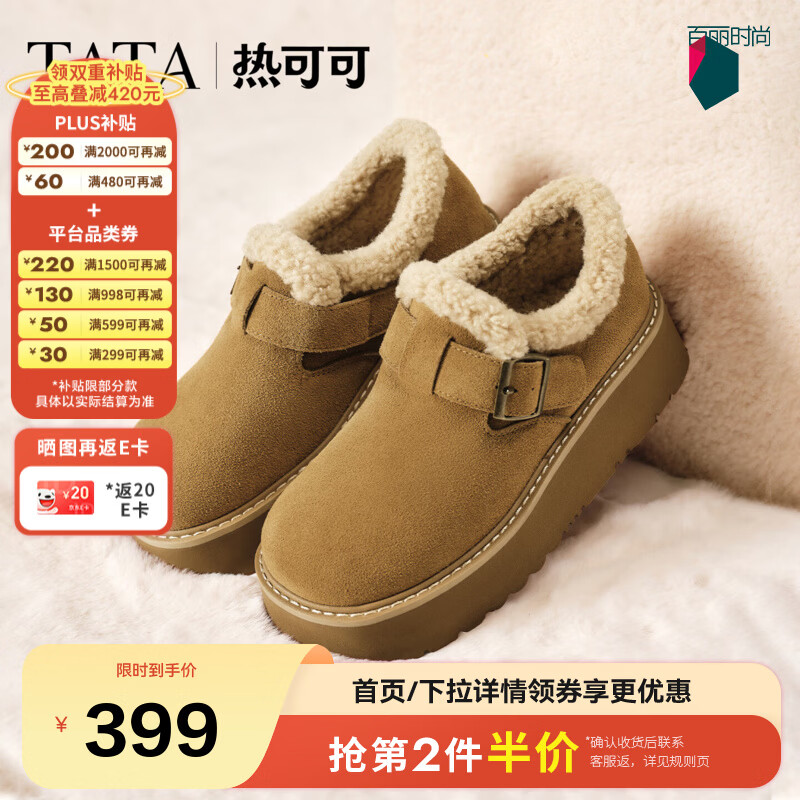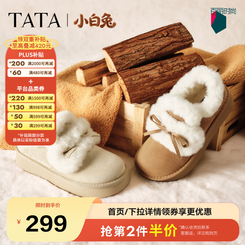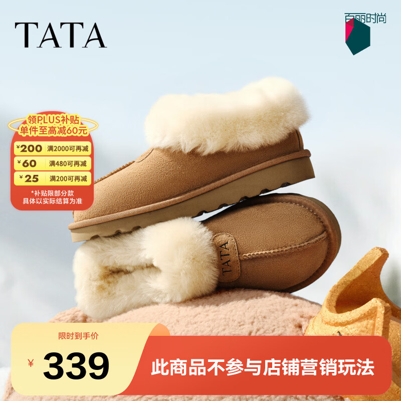 他她(TATA)雪地靴女2025新款加绒鞋厚底棉鞋冬天女士保暖鞋CUB01DM5 棕黄/米白(仿毛里) 36