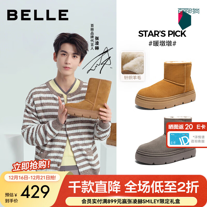 百丽(Belle)张凌赫孙千同款暖墩墩雪地靴女25冬新商场款厚底加毛棉鞋E6C1DDD5 棕色-中筒 37 (235mm)