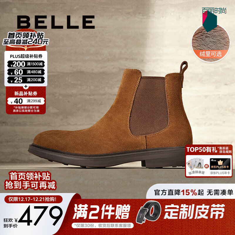 百丽(Belle)男鞋加绒加厚短靴冬季新款休闲户外切尔西马丁工装靴A1691DD4预售 棕色-绒里(绒面款) 44 (270mm)