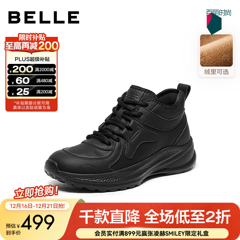 百丽(Belle)运动风休闲靴女2025冬新商场同款厚底增高高帮休闲鞋E6K1DDD5 黑色-绒里 37 (235mm)