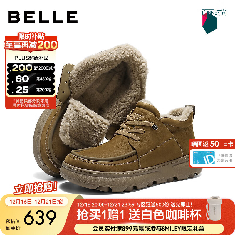 百丽高帮休闲保暖靴男2026新春季商场款牛皮革厚底工装鞋8ZW01AD6预售 卡其色 44 (270mm)
