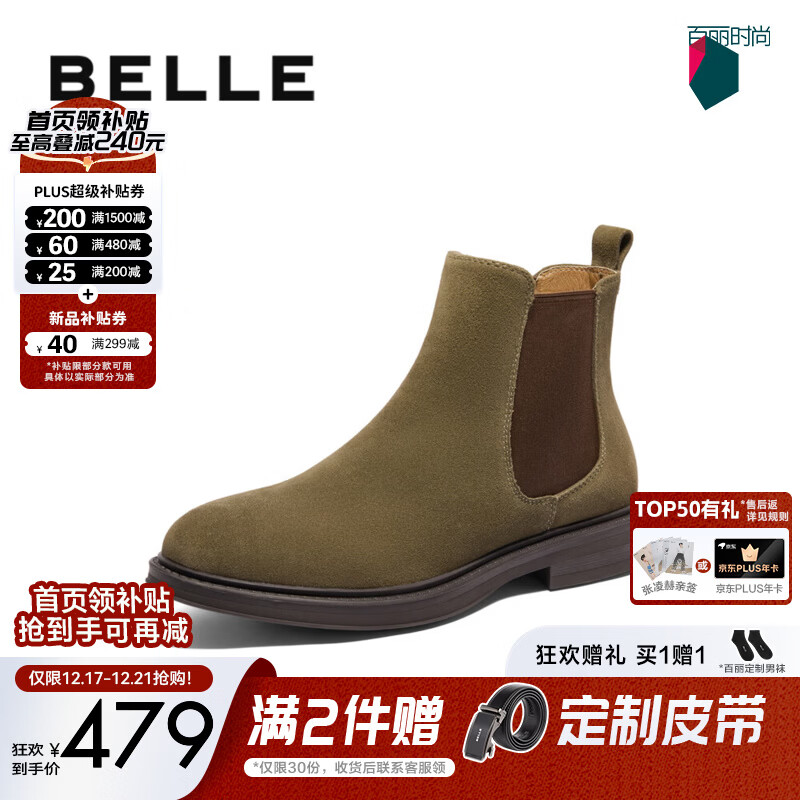 百丽(Belle)男鞋加绒加厚短靴冬季新款休闲户外切尔西马丁工装靴A1691DD4预售 绿色-单里(绒面款) 38 (240mm)