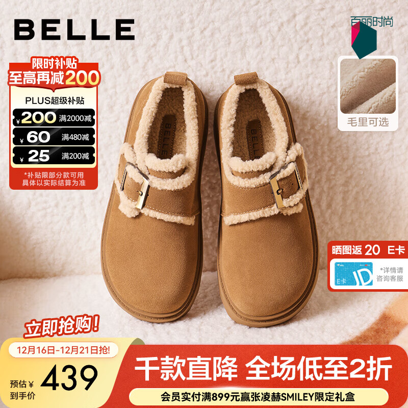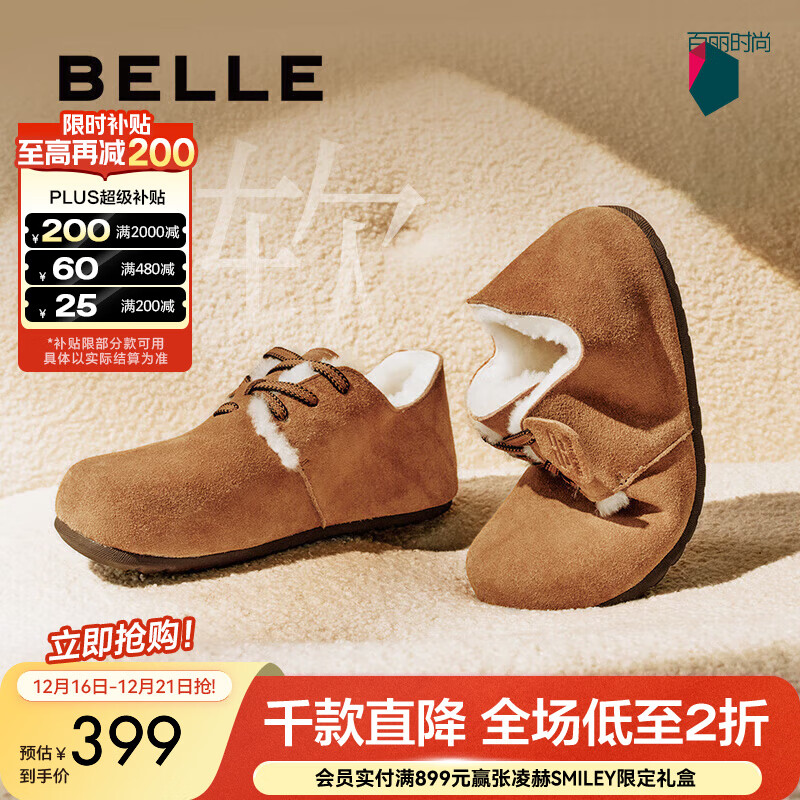 百丽(Belle)复古毛边雪地靴女2025冬新商场同款舒适毛里休闲鞋E5N1DDM5预售 棕色 37 (235mm)