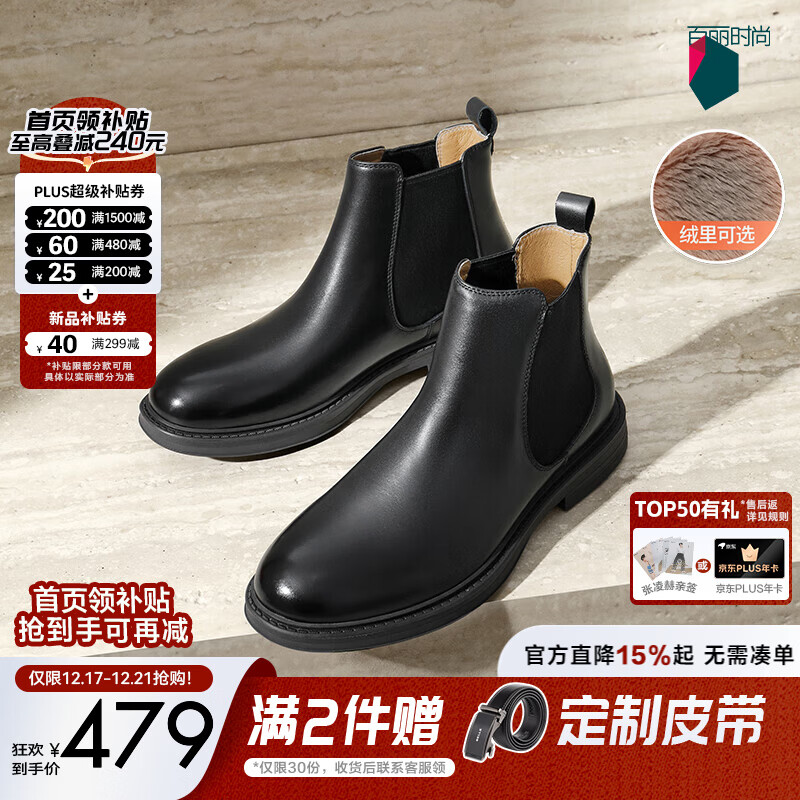 百丽男鞋商务切尔西靴子冬季新款加绒厚底马丁靴A1690DD4预售 棕色-绒里(绒面款) 44 (270mm)