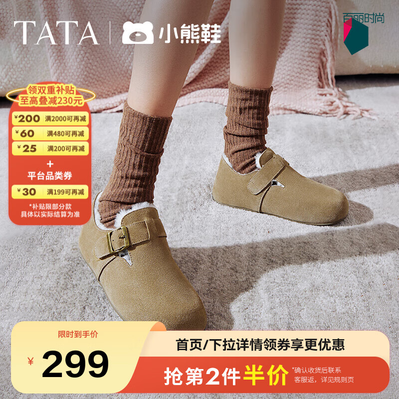 他她(TATA)女鞋2025冬季新款加绒勃肯鞋保暖鞋子棉鞋休闲鞋CF702DM5 米杏(绒里) 36
