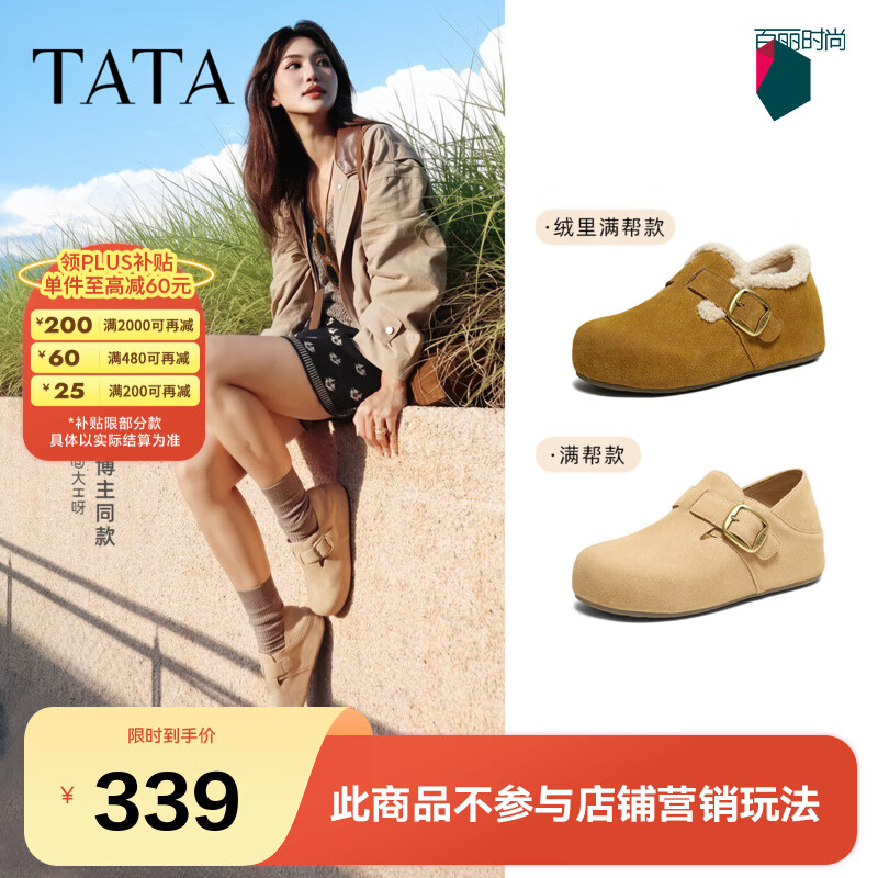 他她(TATA)女鞋2025冬季新款加绒勃肯鞋保暖鞋子棉鞋休闲鞋CF702DM5 米杏(绒里) 35