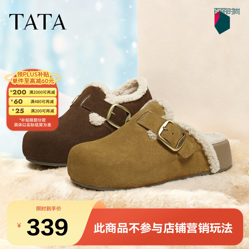 他她(TATA)栗子勃肯鞋女鞋新款加绒厚底休闲鞋毛毛棉拖鞋子4UL02DH5 棕色(仿毛里) 36