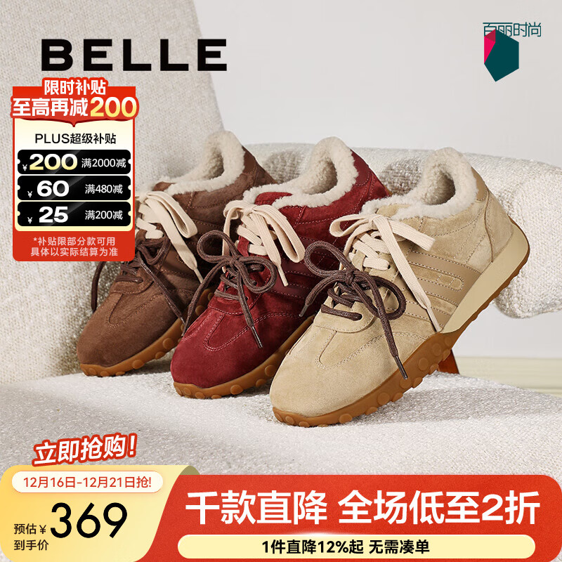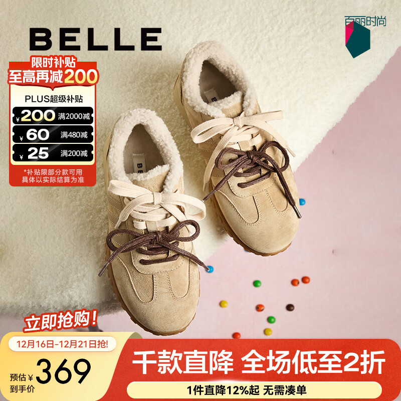 百丽(Belle)彩虹豆加绒德训鞋女鞋商场同款运动风阿甘鞋D2Z1DAM5 杏色 35 (225mm)