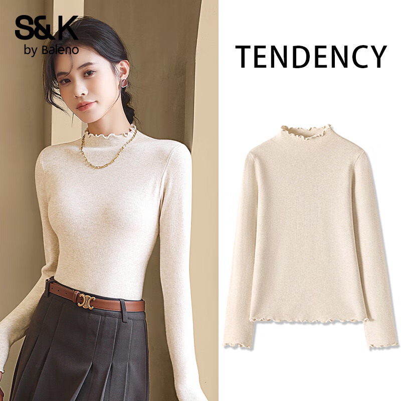 班尼路(Baleno)S&K系列毛衣女装加厚保暖半高领针织衫内搭秋装新款木耳边上衣服 燕麦#纯色 【木耳边毛衫】 L