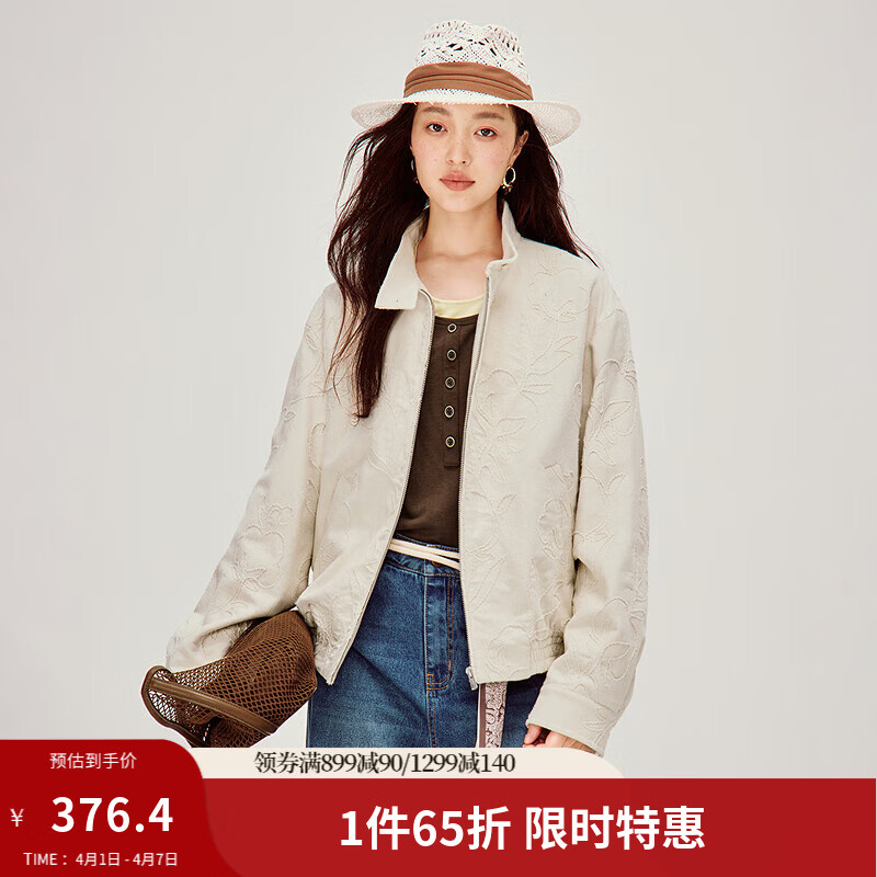 茵曼(INMAN)休闲百搭重工盘绳绣花外套2026春季女装新款宽松短款夹克上衣 米杏色 S