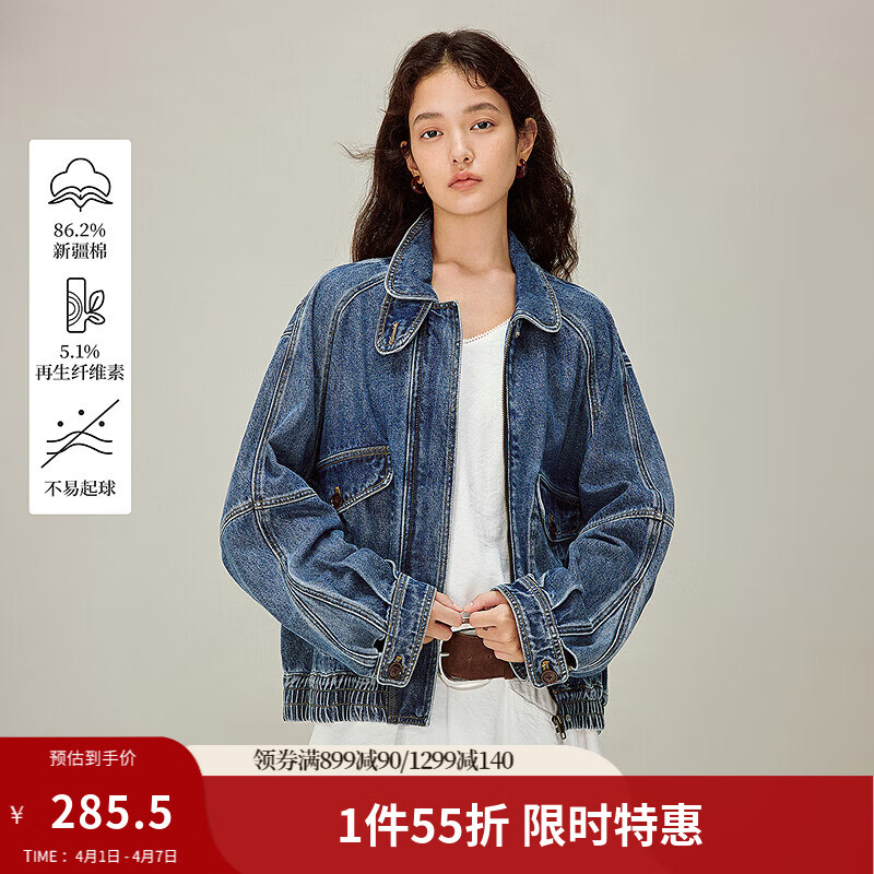茵曼(INMAN)设计感复古水洗立领牛仔外套2026春季女装新款短款飞行员夹克 牛仔蓝 M