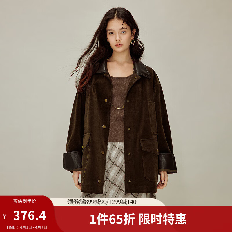 茵曼(INMAN)巴恩风植绒拼接夹克外套2026春季女装新款复古工装风宽松上衣 咖色 M