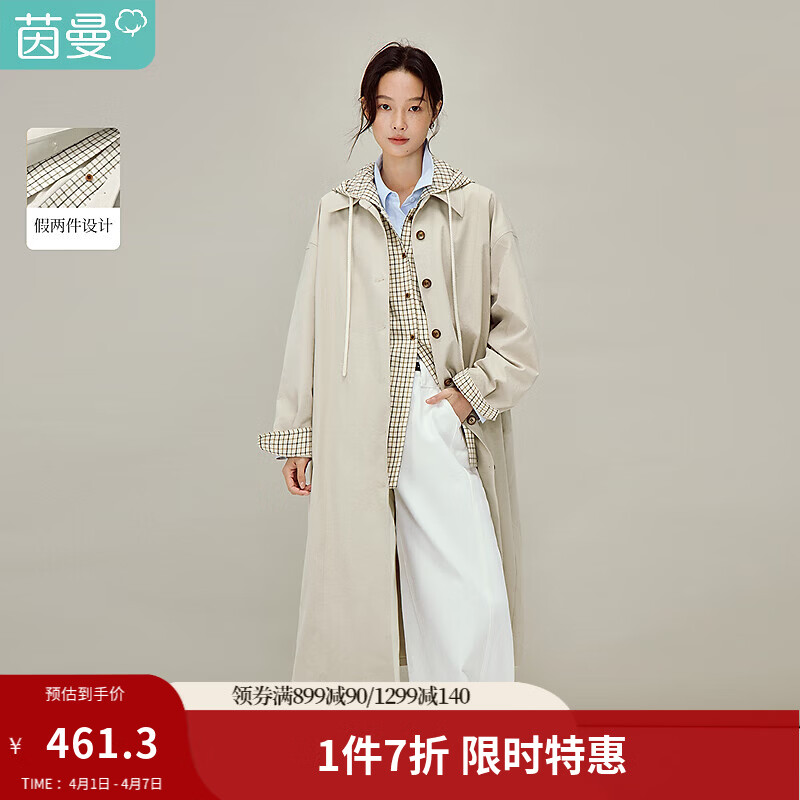 茵曼(INMAN)学院撞色格纹连帽风衣2026春季女装新款高级感宽松长款外套 浅米杏 M