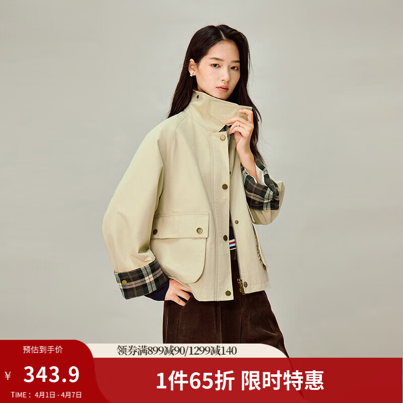 茵曼(INMAN)100棉条纹袖口立领风衣2026春季女装新款短款宽松插肩袖外套 深卡其 M