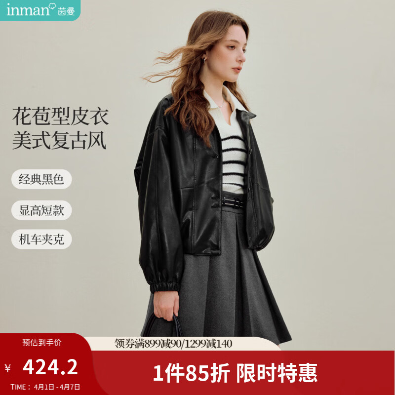 茵曼(INMAN)2026春季女装新款简约立领皮衣黑色外套短款夹克上衣 午夜黑 L 168-172cm /121-130斤