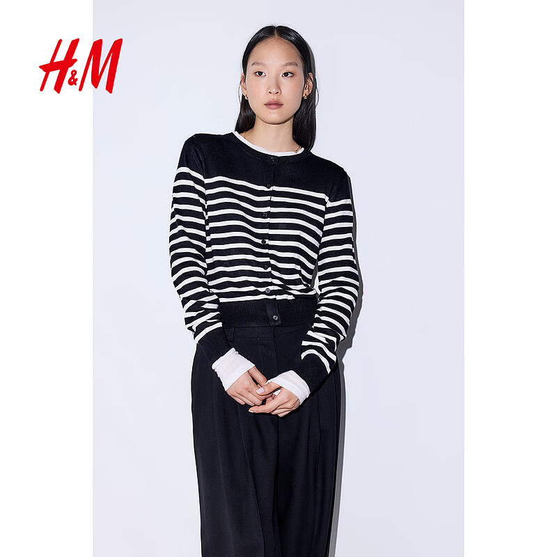 H&M女装针织衫春季时尚慵懒打底衫短款薄外套0579541 黑色/白色条纹 M 165/96