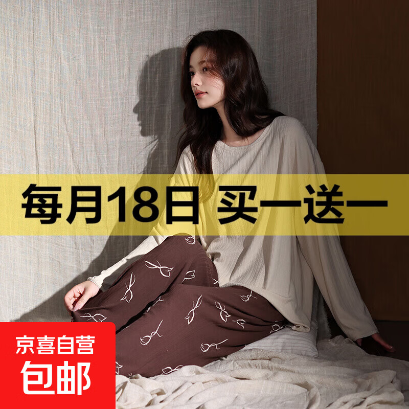 【超柔软】莫代尔薄款春秋睡衣女印花时尚少女宽松长袖家居服套装 85017-浅沙色 L