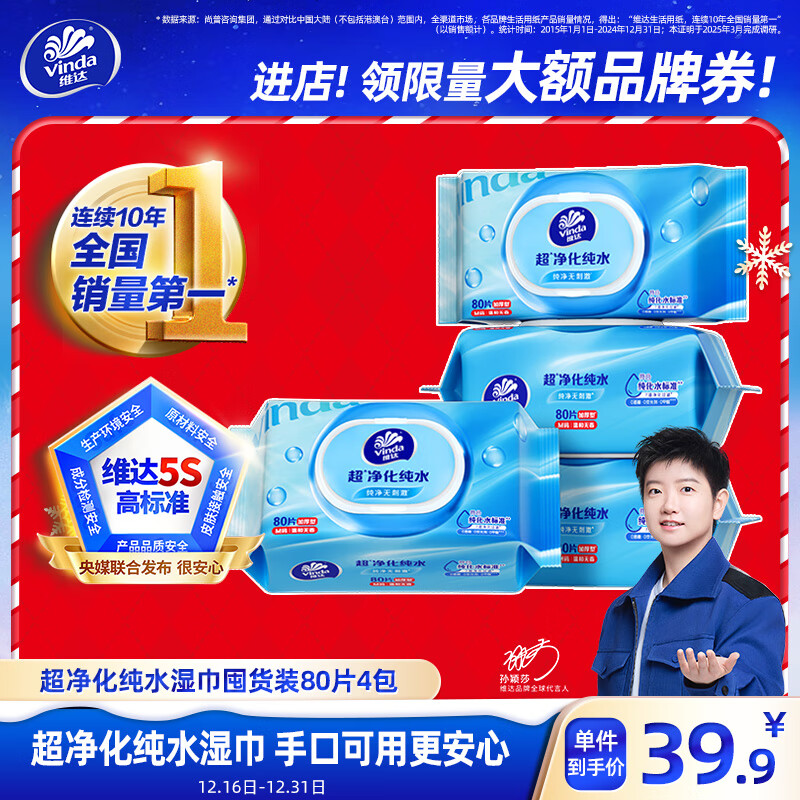维达(Vinda)超净化纯水湿巾 80片*4包 婴儿湿巾手口可用 湿巾大包