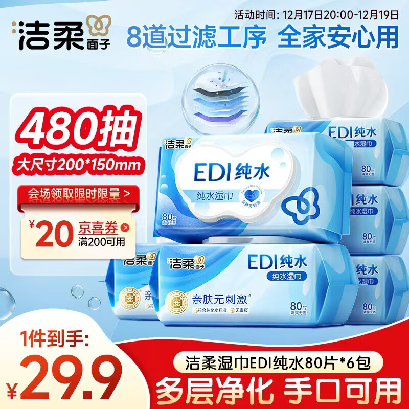 洁柔EDI纯水湿巾80抽*6包大码200*150八道净化洁肤柔婴儿湿纸巾无酒精