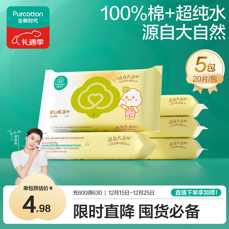 全棉时代手口专用湿巾 20片*5包 清洁湿巾纸100%纯棉出行便携全家可用