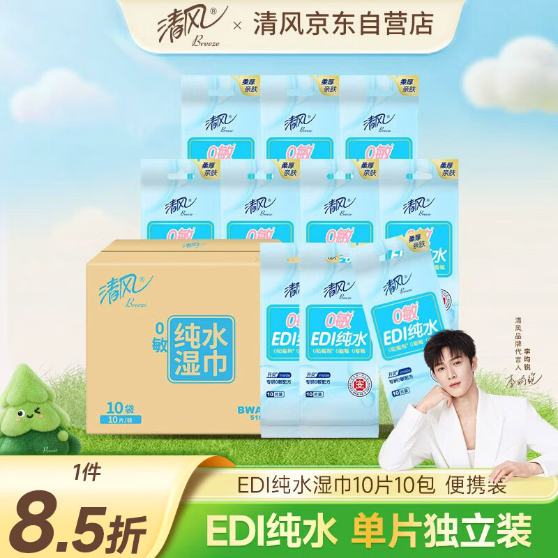 清风【李昀锐同款】纯水湿巾10片*10包便携装 独立小包装 手口可用