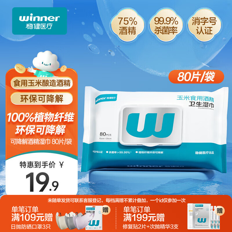 稳健75%酒精湿巾80片/袋99.9%杀菌消毒清洁湿巾大包加大加厚卫生湿巾