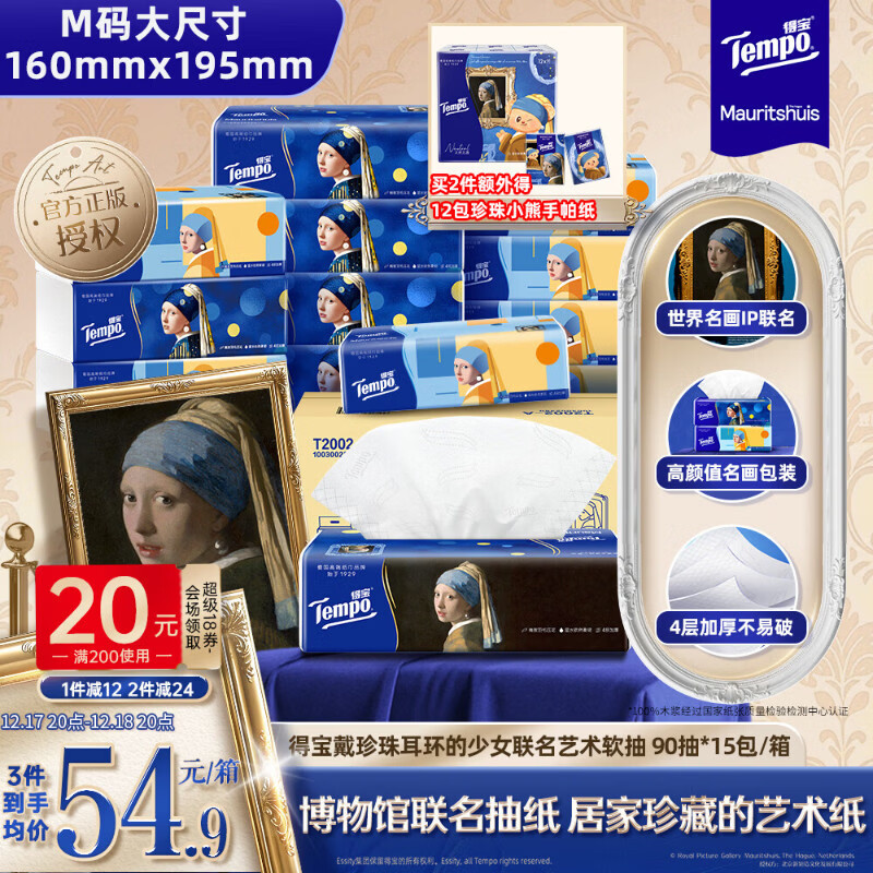 得宝(TEMPO)戴珍珠耳环的少女联名艺术抽纸 4层90抽*15包 湿水不易破 纸巾