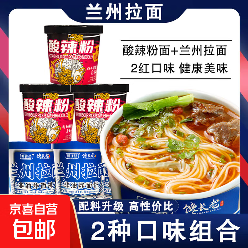 兰州拉面非油炸方便面牛肉拉面免煮桶装整箱批发速食早餐冲泡速食 兰州拉面3桶+酸辣粉面3桶