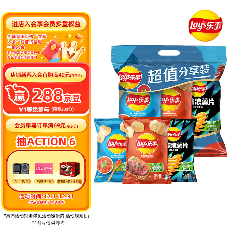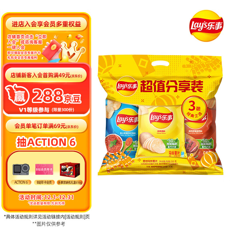 乐事(Lay's)薯片(原味+红烩味+烧烤味)70g*3包 超值分享装 零食大礼包