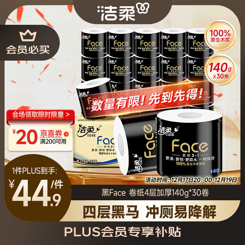 洁柔有芯卷纸 黑Face4层140克*30卷 厚韧耐用 卫生纸卷筒纸纸巾整箱