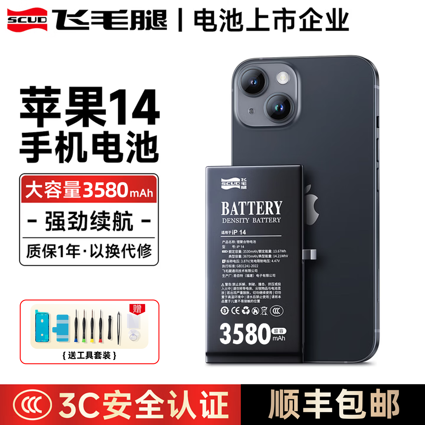 飞毛腿(SCUD)2026年新款适用于苹果11/12/13/14/15ProMax手机电池iPhoneX/XsMax/xr更换6/6S/7/8Plus大容量电芯 3630mAh 苹果13 升级超容版